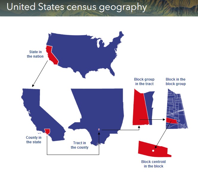 Description: <DIV STYLE="text-align:Left;"><DIV><DIV><P><SPAN>The United States Census Bureau reports data by various political and statistical geographic units. The top-to-bottom relationship shown here represents a statistical hierarchy of containment: the nation contains states, states contain counties, counties contain tracts, tracts contain block groups, and block groups contain blocks. Many other non-nesting reporting units are not shown.</SPAN></P><P><SPAN>Census tracts are statistical subdivisions of a county that aim to have roughly 4,000 inhabitants. Tract boundaries are usually visible features, such as roads or rivers, but they can also follow the boundaries of national parks, military reservations, or American Indian reservations. Tracts are designed to be fairly homogeneous with respect to demographic and economic conditions when they are first established. When a census tract experiences growth and the internal population grows beyond 8,000 persons, the tract is split up. This review and revision process is conducted every decade with collaboration from local planning agencies.</SPAN></P><P><SPAN>A block group is a subdivision of a census tract and contains a cluster of blocks. Block groups usually have between 250 and 550 housing units.</SPAN></P><P><SPAN>A census block is the smallest geographic census unit. Blocks can be bounded by visible features—such as streets—or by invisible boundaries, such as city limits. Census blocks are often the same as ordinary city blocks. Census blocks change every decade.</SPAN></P><P><SPAN>You can review the data directly from the US Census </SPAN><A href="https://www.census.gov:443/geographies/mapping-files/time-series/geo/tiger-line-file.html" STYLE="text-decoration:underline;"><SPAN>here</SPAN></A><SPAN>.</SPAN></P></DIV></DIV></DIV>